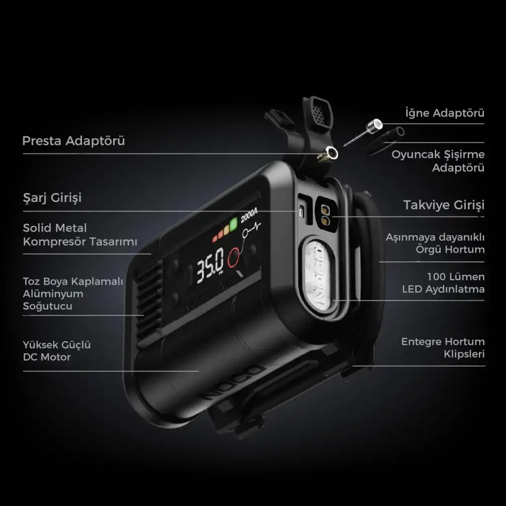 • NOCO AX65 12V Lityum 2000Amp Akıllı Akü Takviye + Pompa + Powerbank + Led Lamba • Tüm 12Volt akülü motorlu araçlarda 2000Ah anlık başlangıç ile başka bir otomobile gerek duymadan aracınızın motorunu anında çalıştırır. • Başka bir otomobile veya ara kabloya gerek olmadan güçlü Lityum aküsüyle 2000 Ampere kadar anlık başlangıç ile Otomobil, Motosiklet, ATV, Kamyonet, Tekne, Traktör, Çim Biçme, Karavan ve daha birçok aracın motorunu anında çalıştırmanızı sağlar. • Entegre 100 PSI / 6.90 BAR ayarlanabilir 280Watt güçlü lastik şişirme pompası ile Otomobil, motosiklet, 4x4, SUV araçlar, bisiklet lastikleri ve top gibi havası tamamen inmiş lastikleri dakikalar içinde şişirmenizi sağlar. • Powerbank özelliği ile 20000mAh. Kapasitesine sahip Lityum entegre akü ve 60W’a kadar hızlı şarj edebilen Type-C çıkış portu sayesinde cep telefonu, tablet, kamera, bilgisayar gibi elektronik eşyalarınızı şarj edebilmenizi veya takviye cihazınızı şarj edebilmenizi sağlar. • Tamamen bitmiş bir aküyü saniyeler içerisinde takviye etme imkânı. • Yüksek basınç hassasiyeti ile sınıfının en hassas lastik basınç sensörüne sahiptir. • Derin deşarj koruması sayesinde akü takviyenizin voltajı sıfır volta düşmez ve uzun ömürlü şarj/deşarj döngüsü sağlar. • 8,0 Lt. kadar benzinli motorları takviye eder ve 6,0 Lt. kadar dizel motorları takviye yaparak çalıştırmanızı sağlar. • 12V Sulu Akü, Gel Akü, MF Akü, AGM Akü, EFB Akü, (Kurşun Asit Aküler) takviye etmenizi sağlar. • Aşırı şarj, derin deşarj, aşırı sıcaklık, düşük sıcaklık, kısa devre gibi farklı koruma yöntemleri sayesinde daha uzun ömürlü ve güvenli kullanım imkânı sağlar. • Entegre mikro işlemci sayesinde dijital ekran üzerinde basınç değerlerini en doğru şekilde göstererek kullanıcı ve makine güvenliğini en üst seviyede tutmasını sağlar. • Entegre LCD dijital ekran sayesinde, lastik basınç değerlerini ve arıza tespit uyarılarını görmenizi sağlar. • SOS ve acil durum flaşı dâhil olmak üzere 6 farklı konumda kullanılabilir parlak 100 lümen LED lamba. • Lityum akü takviye cihazı şarjını bir yıl boyunca muhafaza eder, bu sayede istediğiniz an kullanıma hazırdır. • Type-C Şarj portu sayesinde akıllı telefon, tablet, bilgisayar, kamera ve benzeri elektronik ürünler, kamp ürünleri, dağcılık ürünlerinizi şarj etme imkânı ve 50 cm uzunluğunda Type-C şarj kablosu sayesinde geniş kullanım alanı sunar. • Ağır hizmet tipi döküm pompa gövdesi ile uzun süre profesyonel kullanım. • Akünüzdeki güç 2 Volt ’tan bile düşük ise takviye için özel tasarlanan Manual Override takviye mod’u sayesinde anında takviye etme imkânı. • PSI & BAR & KPA göstergeli Led aydınlatmalı dijital LCD ekran. • Takviye Türü: 12V Kurşun Asit Aküler • Pil Kapasitesi: 31.8Wh- LITYUM-İYON • Anlık Takviye Gücü: 2000A • Takviye Aralığı: 8,0 Lt. Benzin / 6,0 Lt. Dizel Motorlar • Aydınlatma Gücü: 100 Lümen • Lastik Şişirme Gücü: 100 PSI / 6.90 BAR • Hava Basma Gücü: 67Lt. / Dk. • Hortum Uzunluğu: 90 Cm • Type-C Çıkışı: 5V/3A – 9V/3A – 12V/3A – 15V/3A – 20V/3A • Çalışma Sıcaklığı: -20 ˚ C / +50 ˚ C • Çalışma Akımı (Pompa): 12V / 22A / 280W • Ölçüler: 21.5 x 16.7 x 9,9 Cm • Paket İçeriği: Takviye Maşaları, 3 Adet Şişirme Ucu, Type-C USB Şarj Kablosu, 1 Adet Mikrofiber Taşıma Çantası. • Ağırlık: 3,70 Kg. (Kıskaçlar ve Hava Hortumu Dahil)