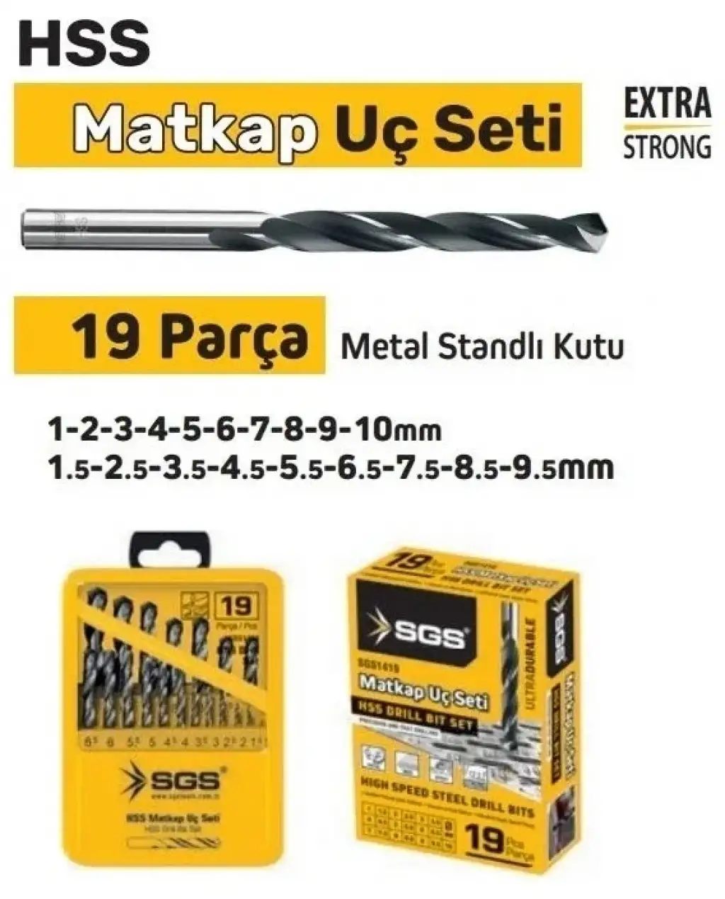 Metal işleme ve montaj projelerinde profesyonel performans sunan SGS 19 Parça HSS Metal Matkap Ucu Seti, yüksek hız çeliğinden (HSS) üretilmiş dayanıklı bir settir. 1 mm'den 10 mm'ye kadar en sık kullanılan ölçüleri içeren bu set, hem atölye ortamında hem de ev tipi tamiratlarda delme işlemlerini hızlı ve pürüzsüz hale getirir.