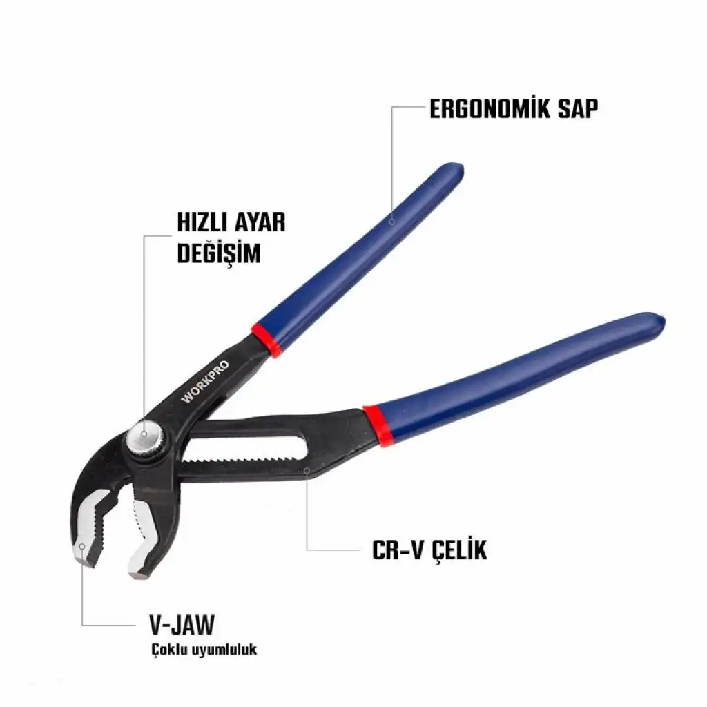• WORKPRO WP231086 200MM CR-V Profesyonel Ayarlı Düğmeli Fort Pense • Sanayi, İnşaat, Otomotiv, Şantiye, sıhhi tesisat, Acil durumlar gibi her türlü mekanik aletlerin bakım ve onarımlarında profesyonel ve uzun ömürlü kullanım için aşınmaya ve paslanmaya dayanıklı krom Vanadium dövme karbon çelik malzemeden üretilmiştir. • Yüksek kaliteli CR-V dövme çelik kullanılmıştır, hassas ve ısıl işlemden sonra ve çapraz kavrama çene dişleri daha sert ve dayanıklı hale getirilmiştir. • Pense uçları ve çapraz kavrama dişleri, pense kolları yüksek baskı mukavemetli modifiye edilmiş dövme CR-V çelikten üretilmiştir. • V-JAW tasarımlı çene tasarımı sayesinde cıvata ve somunlara karşı üstün kavrama sağlar. • Hızlı ayarlanabilen yaylı pim sayesinde istenilen açıklıkta açılabilir ve kilitlenerek geri kayması engellenir. • Dar alanlarda rahat çalışmayı sağlayan dar çelik gövde yapısı. • CR-V çelikten üretilmiş yapısı, pas ve korozyon gibi dış etkenlerden koruyarak uzun ömürlü yapı kazandırır. • %30 daha geniş Üst düzey kauçuk kaplama sap tasarımı kaymayı önler, el yorgunluğunu azaltır.
